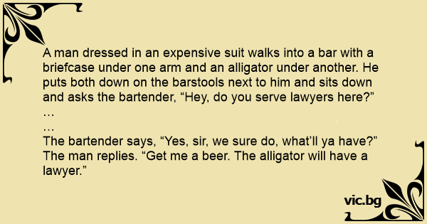 A man dressed in an expensive suit walks into a bar with a briefcase under one arm and an alligator under another. He puts both down on the barstools next to him and sits down and asks the bartender, “Hey, do you serve lawyers here?” …