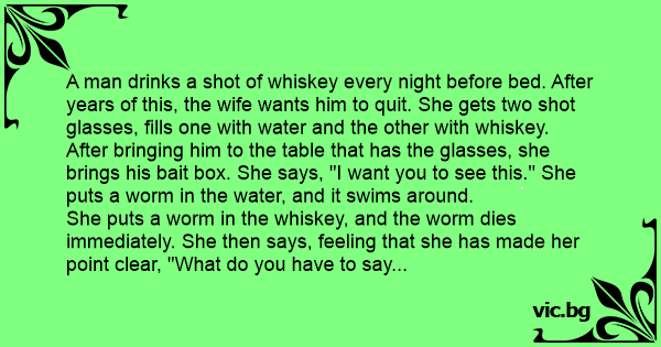 Решила учителката да покаже на децата вредното влияние на алкохола. Събрала ги в класната стая и взела в една ръка купичка пълна с водка, а в другата един червей. Топнала тя червея във водката, а той се сгърчил и умрял.