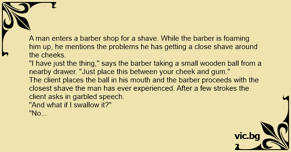 The client places the ball in his mouth and the barber proceeds with the closest shave the man has ever experienced. After a few strokes the client asks in garbled speech.