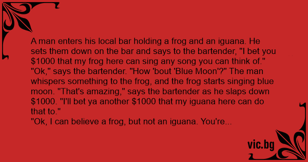 "Ok," says the bartender. "How 'bout 'Blue Moon'?" The man whispers something to the frog, and the frog starts singing blue moon. "That's amazing," says the bartender as he slaps down $1000. "I'll bet ya another $1000 that my iguana here can do that to."
