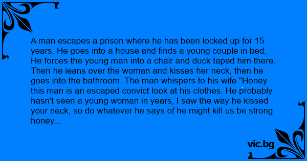 Then he leans over the woman and kisses her neck, then he goes into the bathroom. The man whispers to his wife "Honey this man is an escaped convict look at his clothes. He probably hasn't seen a young woman in years, I saw the way he kissed your neck, so do whatever he says of he might кill us be strong honey love you."