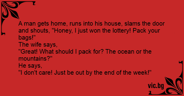 A man gets home, runs into his house, slams the door and shouts, "Honey, I just won the lottery! Pack your bags!"
