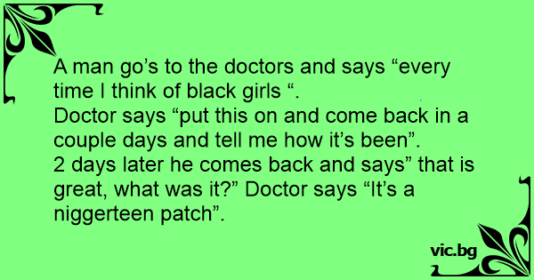 2 days later he comes back and says” that is great, what was it?” Doctor says “It’s a niggerteen patch”.