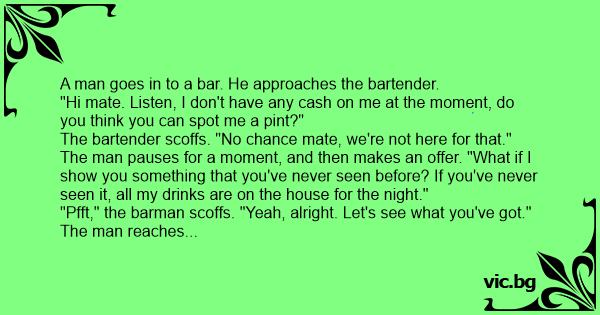 The man pauses for a moment, and then makes an offer. "What if I show you something that you've never seen before? If you've never seen it, all my drinks are on the house for the night."