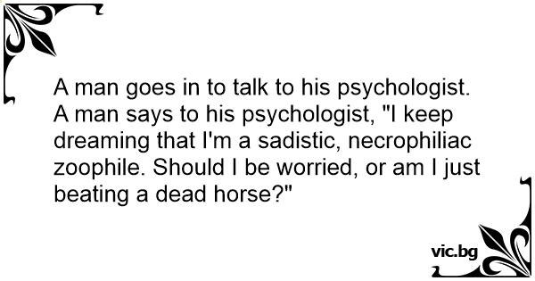 A man says to his psychologist, "I keep dreaming that I'm a sadistic, necrophiliac zоорhilе. Should I be worried, or am I just beating a dead horse?"