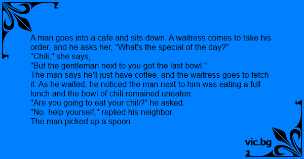 The man says he'll just have coffee, and the waitress goes to fetch it. As he waited, he noticed the man next to him was eating a full lunch and the bowl of chili remained uneaten.