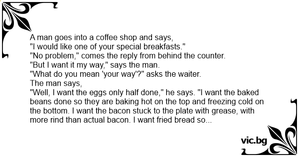 "Well, I want the eggs only half done," he says. "I want the baked beans done so they are baking hot on the top and freezing cold on the bottom. I want the bacon stuck to the plate with grease, with more rind than actual bacon. I want fried bread so greasy that the grease pours out of it."