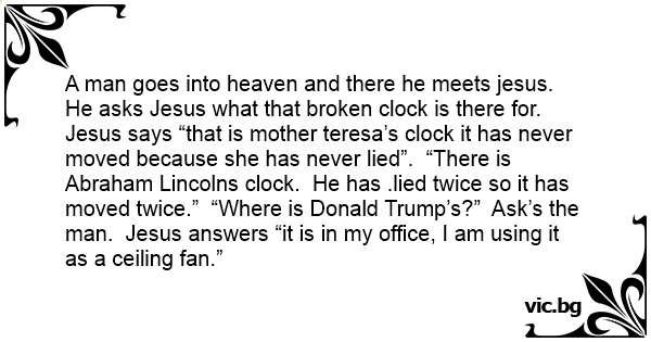 A man goes into heaven and there he meets jesus. He asks Jesus what that broken clock is there for. Jesus says “that is mother teresa’s clock it has never moved because she has never lied”. “There is Abraham Lincolns clock. He has .lied twice so it has moved twice.” “Where is Donald Trump’s?” Ask’s the man. Jesus answers “it is in my office, I am using it as a ceiling fаn.”