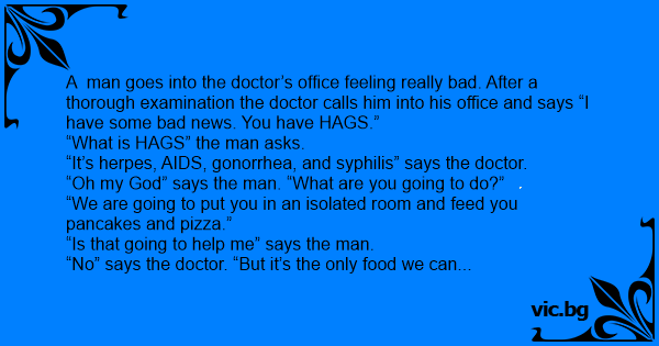 A man goes into the doctor’s office feeling really bad. After a thorough examination the doctor calls him into his office and says “I have some bad news. You have HAGS.”