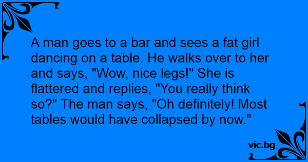 A man goes to a bar and sees a fат girl dancing on a table. He walks over to her and says, "Wow, nice legs!" She is flattered and replies, "You really think so?" The man says, "Oh definitely! Most tables would have collapsed by now."