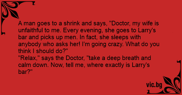 A man goes to a shrink and says, "Doctor, my wife is unfaithful to me. Every evening, she goes to Larry's bar and picks up men. In fact, she sleeps with anybody who asks her! I'm going crazy. What do you think I should do?"