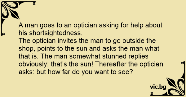 The optician invites the man to go outside the shop, points to the sun and asks the man what that is. The man somewhat stunned replies obviously: that’s the sun! Thereafter the optician asks: but how far do you want to see?