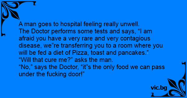 The Doctor performs some tests and says, “I am afraid you have a very rare and very contagious disease, we”re transferring you to a room where you will be fed a diet of Pizza, toast and pancakes.”