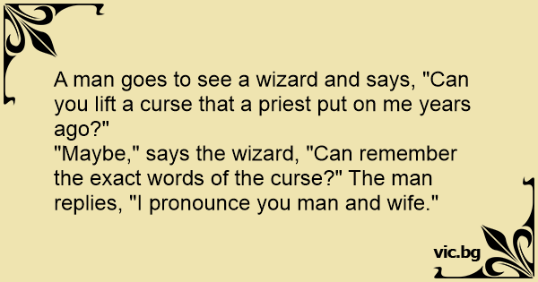 "Maybe," says the wizard, "Can remember the exact words of the curse?" The man replies, "I pronounce you man and wife."
