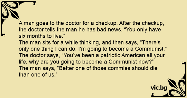 The doctor says, “You’ve been a patriotic American all your life, why are you going to become a Communist now?”