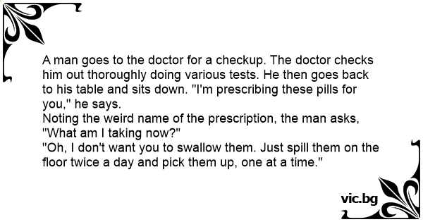 A man goes to the doctor for a checkup. The doctor checks him out thoroughly doing various tests. He then goes back to his table and sits down. "I'm prescribing these pills for you," he says.
