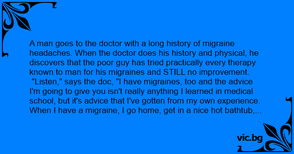 "Listen," says the doc, "I have migraines, too and the advice I'm going to give you isn't really anything I learned in medical school, but it's advice that I've gotten from my own experience. When I have a migraine, I go home, get in a nice hot bathtub, and soak for a while. Then I have my wife sponge me off with the hottest water I can stand, especially around the forehead. This helps a little. Then I get out of the tub, take her into the bedroom, and even if my head is killing me, I force myself to have sеx with her. Almost always, the headache is immediately gone. Now, give it a try, and come back and see me in six weeks."
