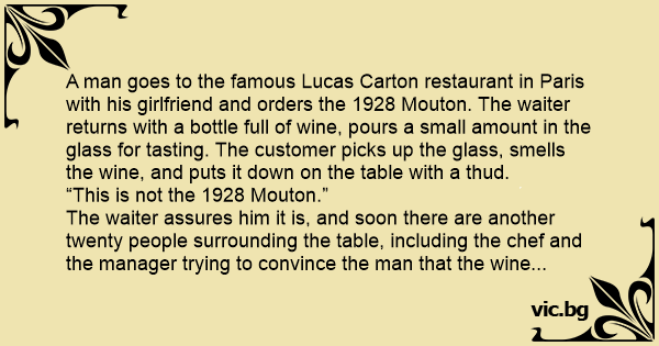 The waiter assures him it is, and soon there are another twenty people surrounding the table, including the chef and the manager trying to convince the man that the wine is the 1928 Mouton.