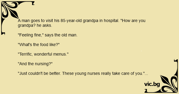 Πάει ο τύπος στο νοσοκομείο, να επισκεφθεί τον 85χρονο παππού του. - Πώς τα περνάς εδώ πέρα, παππού; ρωτάει - Υπέροχα! απαντάει ο παππούς. - Το φαΐ είναι καλό; ξαναρωτάει ο τύπος. - Τέλειο! λέει ο παππούς. - Σε φροντίζουν καλά οι νοσοκόμες; συνεχίζει ο εγγονός. - Καλύτερα δε γίνεται....