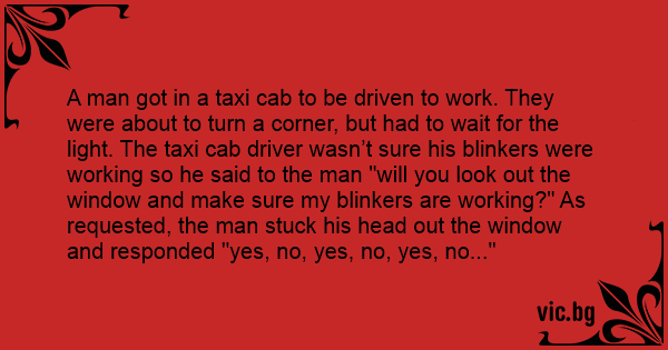 A man got in a taxi cab to be driven to work. They were about to turn a corner, but had to wait for the light. The taxi cab driver wasn’t sure his blinkers were working so he said to the man "will you look out the window and make sure my blinkers are working?" As requested, the man stuck his head out the window and responded "yes, no, yes, no, yes, no..."