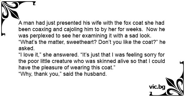 A man had just presented his wife with the fox coat she had been coaxing and cajoling him to by her for weeks. Now he was perplexed to see her examining it with a sad look.