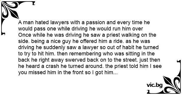 Once while he was driving he saw a priest walking on the side. being a nice guy he offered him a ride. as he was driving he suddenly saw a lawyer so out of habit he turned to try to hit him. then remembering who was sitting in the back he right away swerved back on to the street. just then he heard a crash he turned around. the priest told him I see you missed him in the front so I got him with the back door!!!!