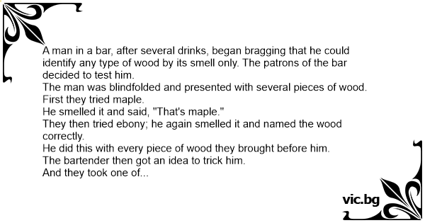 A man in a bar, after several drinks, began bragging that he could identify any type of wood by its smell only. The patrons of the bar decided to test him.