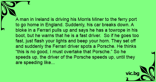 A man in Ireland is driving his Morris Miner to the ferry port to go home in England. Suddenly, his car breaks down. A bloke in a Ferrari pulls up and says he has a towrope in his boot, but he warns that he is a fast driver. So if he goes too fast, just flash your lights and beep your horn. They set off and suddenly the Ferrari driver spots a Porsche. He thinks “this is no good, I must overtake that Porsche.” So he speeds up, the driver of the Porsche speeds up, until they are speeding like a man-on-fire!