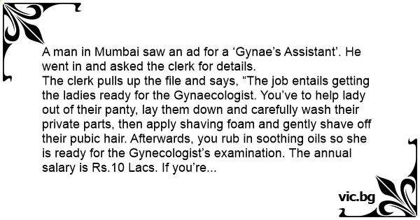 The clerk pulls up the file and says, “The job entails getting the ladies ready for the Gynaecologist. You’ve to help lady out of their раnтy, lay them down and carefully wash their private parts, then apply shaving foam and gently shave off their рuвiс hair. Afterwards, you rub in soothing oils so she is ready for the Gynecologist’s examination. The annual salary is Rs.10 Lacs. If you’re Interested you’ll have to go to Lonavala, 100 Kms from here.”