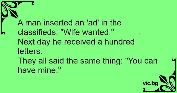 Un uomo mette un annuncio sul giornale: “Cercasi moglie”. Il giorno dopo riceve centinaia di lettere. Dicono tutte: “Prenditi pure la mia!”.