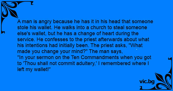 A man is angry because he has it in his head that someone stole his wallet. He walks into a church to steal someone else's wallet, but he has a change of heart during the service. He confesses to the priest afterwards about what his intentions had initially been. The priest asks, "What made you change your mind?" The man says,