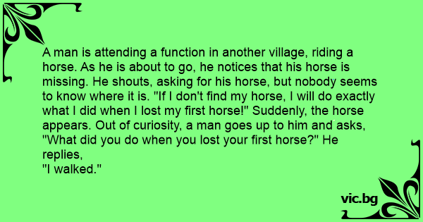 A man is attending a function in another village, riding a horse. As he is about to go, he notices that his horse is missing. He shouts, asking for his horse, but nobody seems to know where it is. "If I don't find my horse, I will do exactly what I did when I lost my first horse!" Suddenly, the horse appears. Out of curiosity, a man goes up to him and asks, "What did you do when you lost your first horse?" He replies,