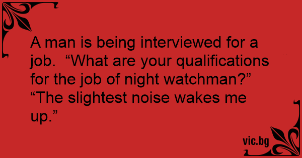 A man is being interviewed for a job. “What are your qualifications for the job of night watchman?” “The slightest noise wakes me up.”