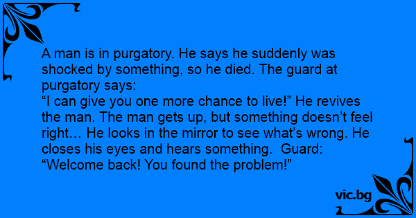 A man is in purgatory. He says he suddenly was shocked by something, so he died. The guard at purgatory says: