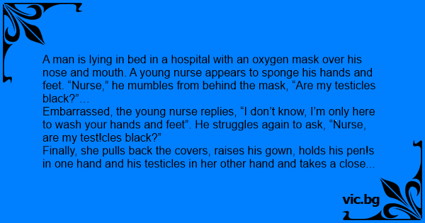 A man is lying in bed in a hospital with an oxygen mask over his nose and mouth. A young nurse appears to sponge his hands and feet. “Nurse,” he mumbles from behind the mask, “Are my testicles black?”…