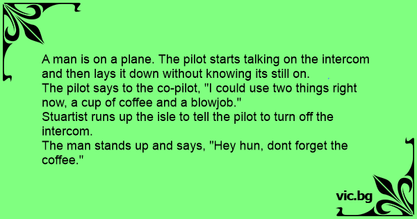 A pilóta felszáll, átkapcsol robot pilótára, nyújtózik egy nagyot, de a Mikrofont bekapcsolva felejti és így szól: - Most iszom egy kávét, utána jól megdugom a kis szőke stewardesst. Hátul a...