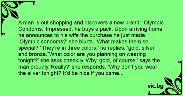 A man is out shopping and discovers a new brand: ‘Olympic Condoms.’ Impressed, he buys a pack. Upon arriving home he announces to his wife the purchase he just made. ‘Olympic condoms?’ she blurts. ‘What makes them so special? ”They’re in three colors,’ he replies, ‘gold, silver, and bronze.”What color are you planning on wearing tonight?’ she asks cheekily.’Why, gold, of course,’ says the man proudly.’Really?’ she responds. ‘Why don’t you wear the silver tonight? It’d be nice if you came second for a change.’