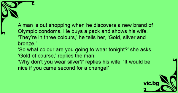 Man komt juichend thuis en zegt tegen zijn vrouw: "Wat ik nou heb! Omdat volgend jaar de Olympische Spelen zijn heeft Durex Olympische condooms op de markt gebracht: goud, zilver en brons! Vrouw:...