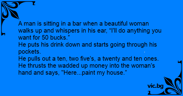 Phil, a smart and handsome young man, dressed in the latest fashion, walked into this local pub. He noticed a woman gazing at him without blinking her big eyes. Phil felt flattered so he walked up to the woman and said in his deepest voice, "I'll do anything you wish, beautiful lady, for just...