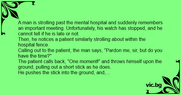 A man is strolling past the mental hospital and suddenly remembers an important meeting. Unfortunately, his watch has stopped, and he cannot tell if he is late or not.