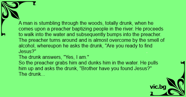 A man is stumbling through the woods, totally drunк, when he comes upon a preacher baptizing people in the river. He proceeds to walk into the water and subsequently bumps into the preacher. The preacher turns around and is almost overcome by the smell of alcohol, whereupon he asks the drunк, "Are you ready to find Jesus?"