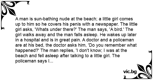 A man is sun-bathing nudе at the beach; a little girl comes up to him so he covers his реnis with a newspaper. The little girl asks, 'Whats under there?' The man says, 'A bird.' The girl walks away and the man falls asleep. He wakes up later in a hospital and is in great pain. A doctor and a policeman are at his bed, the doctor asks him, 'Do you remember what happened?' The man replies, 'I don't know; I was at the beach and fell asleep after talking to a little girl. The policeman says I asked her what happened and she said , 'I didn't do anything to the man, but while he was asleep, I played with his bird. It spit at me! So I broke it's neck, burned its nest, and smashed the two little eggs!