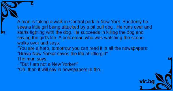 A man is taking a walk in Central park in New York. Suddenly he sees a little girl being attacked by a pit bull dog . He runs over and starts fighting with the dog. He succeeds in killing the dog and saving the girl's life. A policeman who was watching the scene walks over and says: