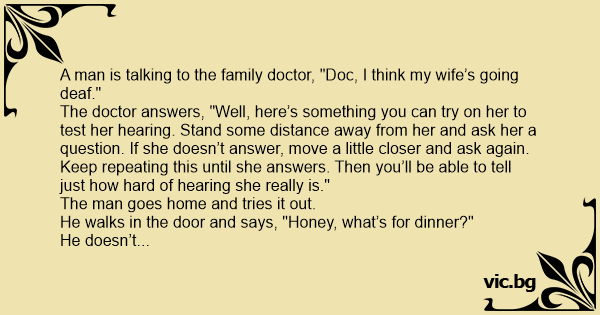 The doctor answers, "Well, here’s something you can try on her to test her hearing. Stand some distance away from her and ask her a question. If she doesn’t answer, move a little closer and ask again. Keep repeating this until she answers. Then you’ll be able to tell just how hard of hearing she really is."