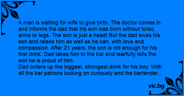 A man is waiting for wife to give birth. The doctor comes in and informs the dad that his son was born without torso, arms or legs. The son is just a head! But the dad loves his son and raises him as well as he can, with love and compassion. After 21 years, the son is old enough for his first drink. Dad takes him to the bar and tearfully tells the son he is proud of him.
