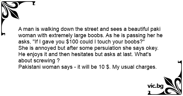 A man is walking down the street and sees a beautiful ракi woman with extremely large воовs. As he is passing her he asks, "If I gave you $100 could I touch your воовs?"
