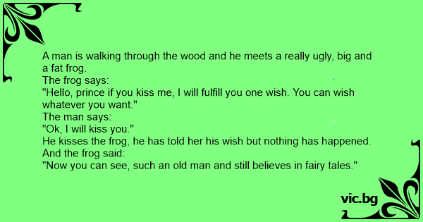 A man is walking through the wood and he meets a really ugly, big and a fат frog.