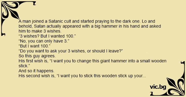 A man joined a Satanic cult and started praying to the dark one. Lo and behold, Sатаn actually appeared with a big hammer in his hand and asked him to make 3 wishes.