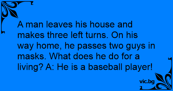 A man leaves his house and makes three left turns. On his way home, he passes two guys in masks. What does he do for a living? A: He is a baseball player!