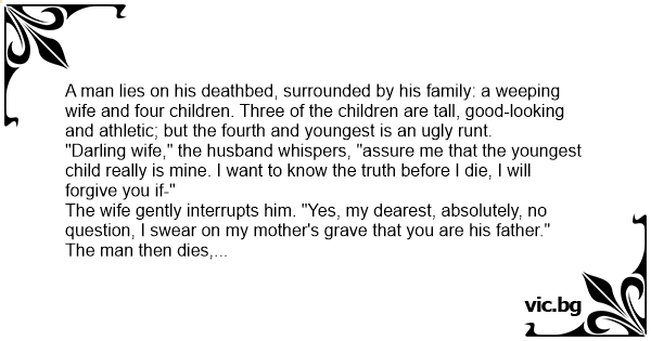 "Darling wife," the husband whispers, "assure me that the youngest child really is mine. I want to know the truth before I die, I will forgive you if-"